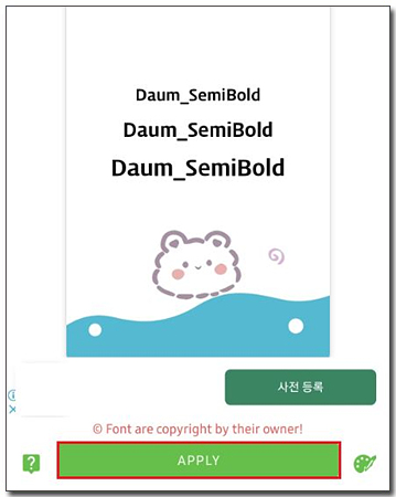 ํฐํธ๋ฅผ ์ง์ ํ๊ฒ ๋๋ฉด ํฐํธ ๊ธ์ ๋ชจ์์ด ๋ํ๋ฉ๋๋ค. ํฐํธ๋ฅผ ํ์ธํ์๊ณ ์๋์ APPLY๋ฅผ ์ ํํ์ฌ ์ฃผ์ธ์.