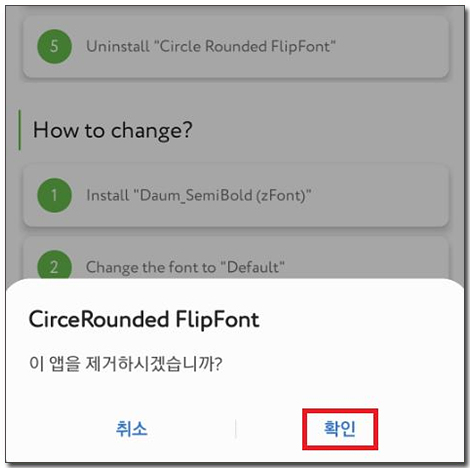 5๋ฒ Uninstall " Circle Rounded Flipfont"๋ฅผ ์ ํํ์ฌ ์ฃผ์ธ์.