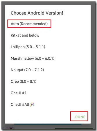Choose Android Version! ์ฐฝ์ด ์ด๋ฆฌ๋ฉด Auto(Recommended)๋ฅผ ์ ํํ๊ณ ํ๋จ์ DONE๋ฅผ ์ ํํ์ฌ ์ฃผ์ธ์.