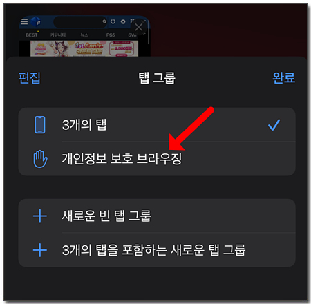 ํญ ๊ทธ๋ฃน์ด ์ด๋ฆฌ๋ฉด "๊ฐ์ธ์ ๋ณด ๋ณดํธ ๋ธ๋ผ์ฐ์ง" ํญ๋ชฉ์ ์ ํํด ์ฃผ์ธ์.