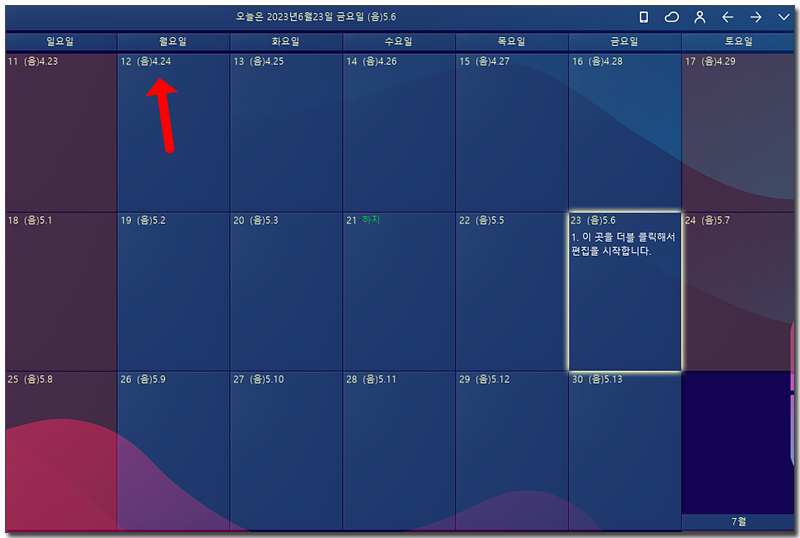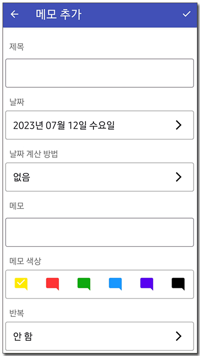 ๋ ๋ฌ๋ ฅ์ ๋ ์ง๋ฅผ ํฐ์นํ๋ฉด ์ผ์ ๋ฉ๋ชจ๋ฅผ ์ถ๊ฐํ ์ ์๊ณ ๋ฉ๋ชจ ์์๊ณผ ์๋ฆผ์ ์ค์ ํ ์ ์์ต๋๋ค.