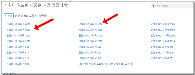 ์ธํ HD๊ทธ๋ํฝ ์ ํ๊ตฐ๋ค์ด ๋ํ๋ฉ๋๋ค. ์ ํ์ด๋ฆ์ ์ซ์ ์์๋ฆฌ๊ฐ CPU ์ธ๋๋ฅผ ๋ปํ๊ธฐ ๋๋ฌธ์ 5์ธ๋๋ 5000์๋ฆฌ์ฆ๋ฅผ ์ ํํด ์ฃผ์๊ณ ํด๋ฆญํ์๋ฉด ๋๋ผ์ด๋ฒ ๋ค์ด๋ก๋ ํ์ด์ง๋ก ์ด๋๋ฉ๋๋ค.